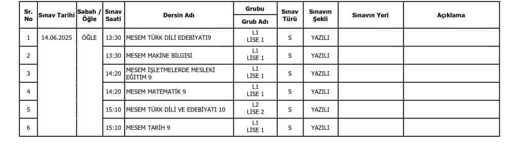 MESEM Haziran Sorumluluk Sınav Takvimi