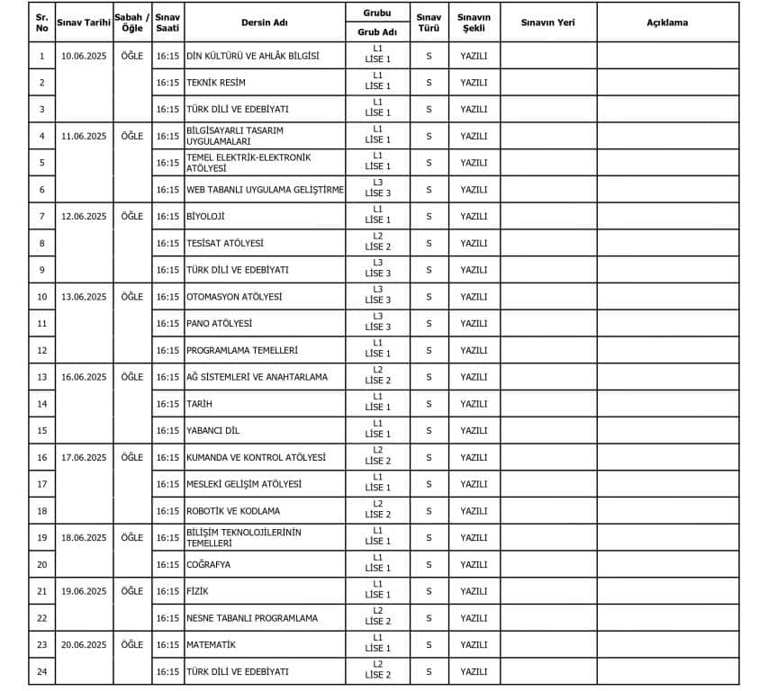 Meslek Lisesi Haziran Sorumluluk Sınav Takvimi